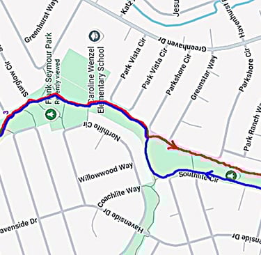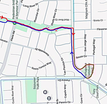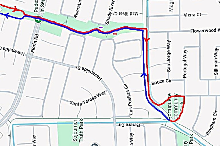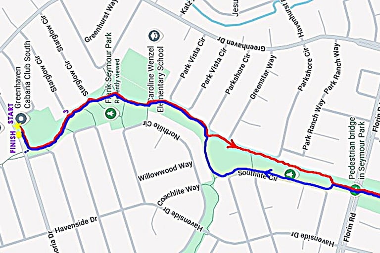 Starting next to the Cabana Club (South) facility, the course will head south through the "Greenbelt" area, thereby utilizing the concrete pathways that intertwine within the park. About three-fourths of a mile into the route, runners will ascend the Florin Road pedestrian overpass, and continue towards the canal section of the course.